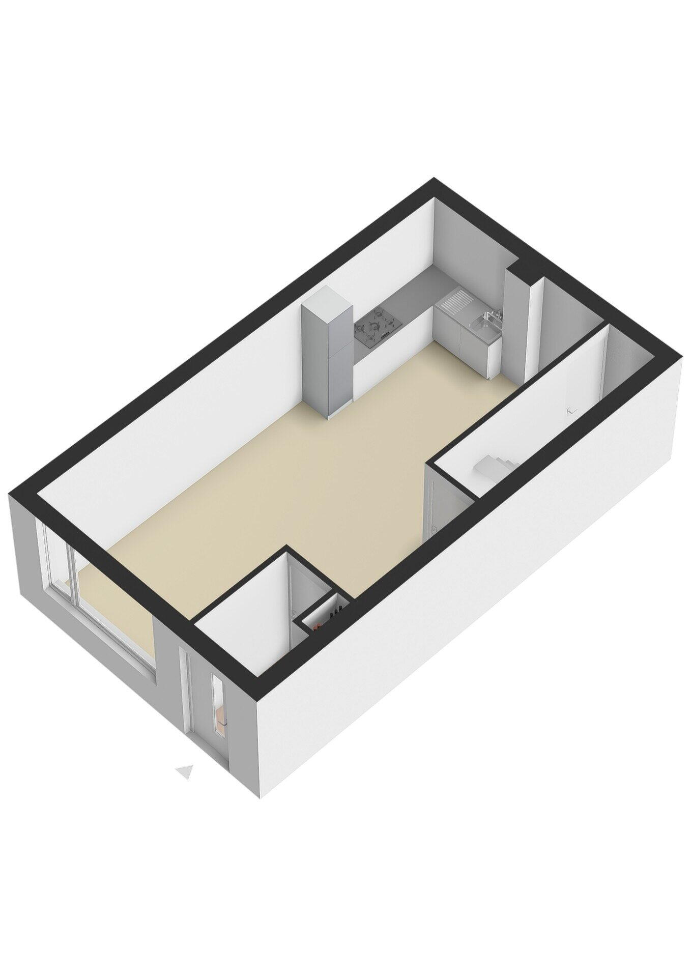 Voorzijde een balkon en toegang tot de woning. Hal. Woonkamer met trapkast en laminaatvloer. Half open keuken met keukeninstallatie in hoekopstelling o.a. voorzien van gaskookplaat, afzuigkap en een combimagnetron. Tochtportaal met trapopgang.